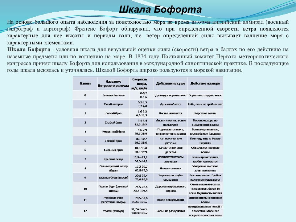 Шкала Бофорта На основе большого опыта наблюдения за поверхностью моря во время шторма английский адмирал ( военный гидрограф и картограф ) Френсис Бофорт обнаружил, что при определенной скорости ветра появляются характерные для нее высоты и периоды волн, т. е. ветер определенной силы вызывает волнение моря с характерными элементами. Шкала Бофорта - условная шкала для визуальной оценки силы (скорости) ветра в баллах по его действию на наземные предметы или по волнению на море. В 1874 году Постоянный комитет Первого метеорологического конгресса принял шкалу Бофорта для использования в международной синоптической практике. В последующие годы шкала менялась и уточнялась. Шкалой Бофорта широко пользуются в морской навигации.
