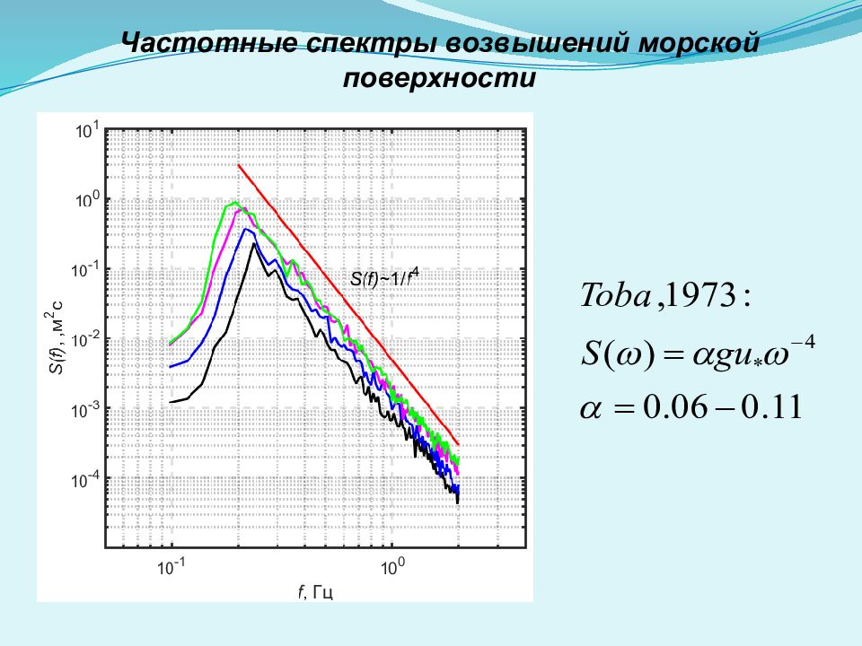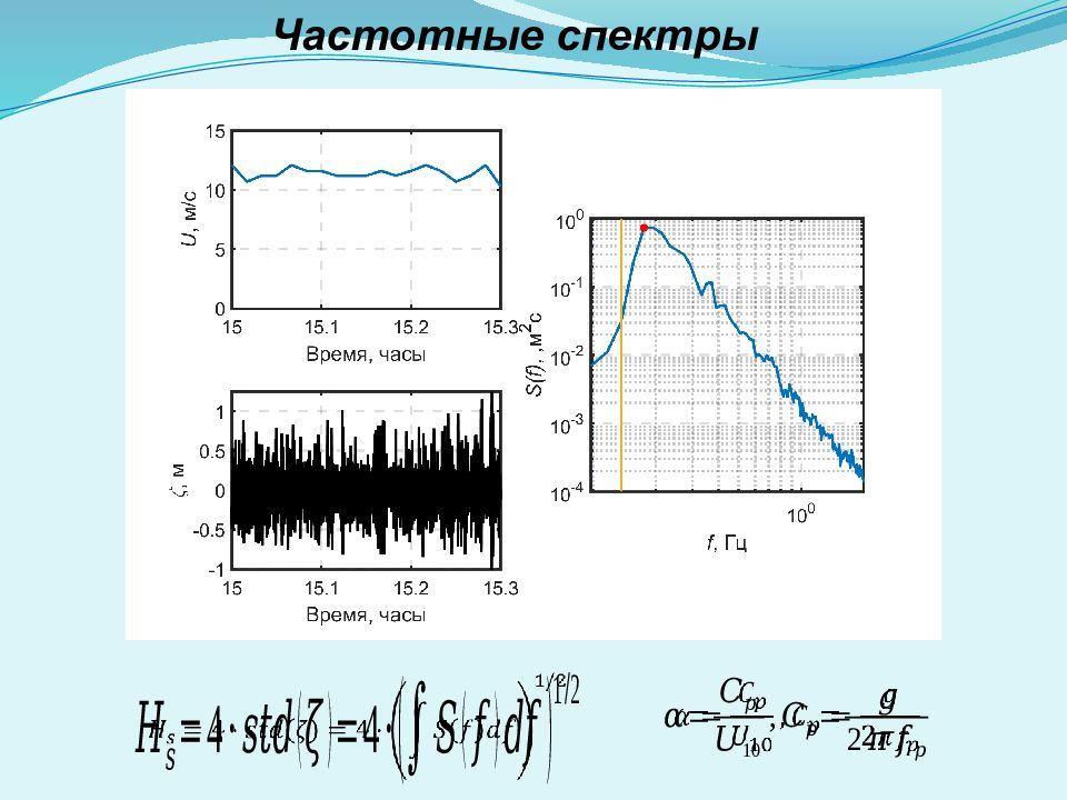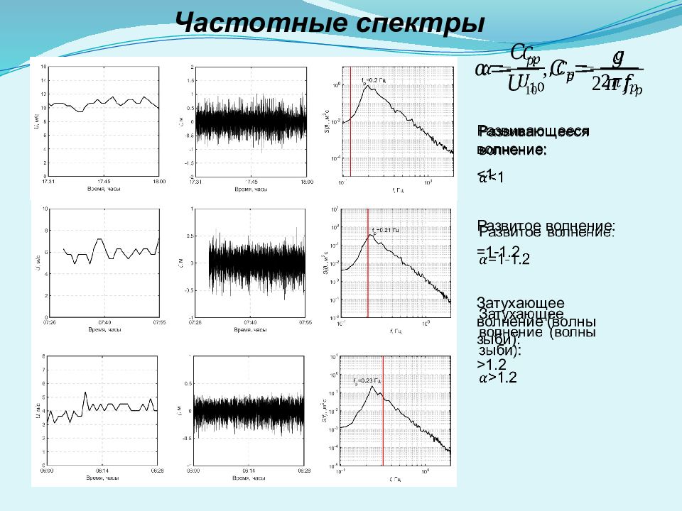 Развивающееся волнение: < 1 Развитое волнение: =1 -1.2 Затухающее волнение (волны зыби): > 1.2 Частотные спектры