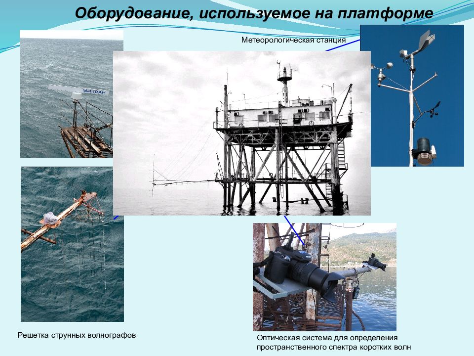 Решетка струнных волнографов Метеорологическая станция Радиолокационная станция X- диапазона Оптическая система для определения пространственного спектра коротких волн Оборудование, используемое на платформе