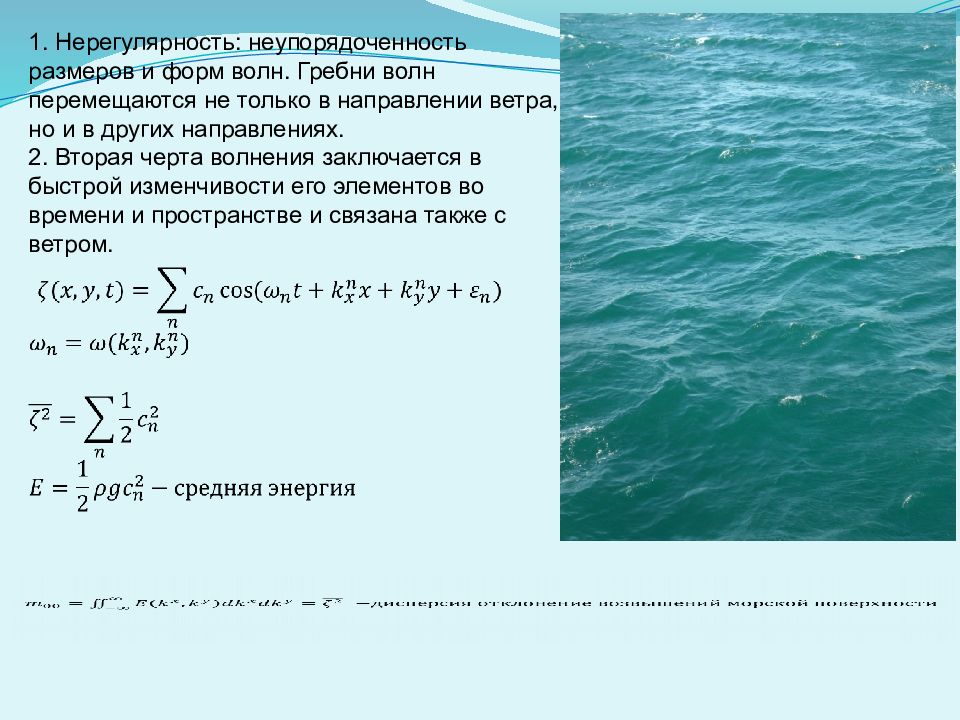 1. Нерегулярность: неупорядоченность размеров и форм волн. Гребни волн перемещаются не только в направлении ветра, но и в других направлениях. 2. Вторая черта волнения заключается в быстрой изменчивости его элементов во времени и пространстве и связана также с ветром.