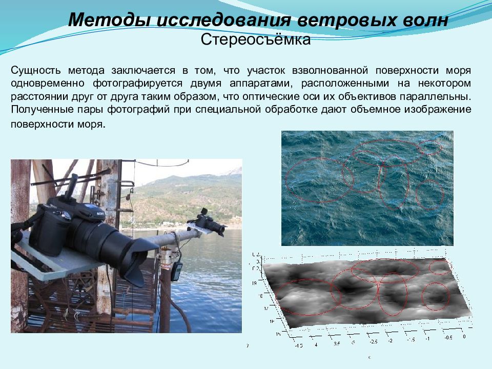 Сущность метода заключается в том, что участок взволнованной поверхности моря одновременно фотографируется двумя аппаратами, расположенными на некотором расстоянии друг от друга таким образом, что оптические оси их объективов параллельны. Полученные пары фотографий при специальной обработке дают объемное изображение поверхности моря. Стереосъёмка