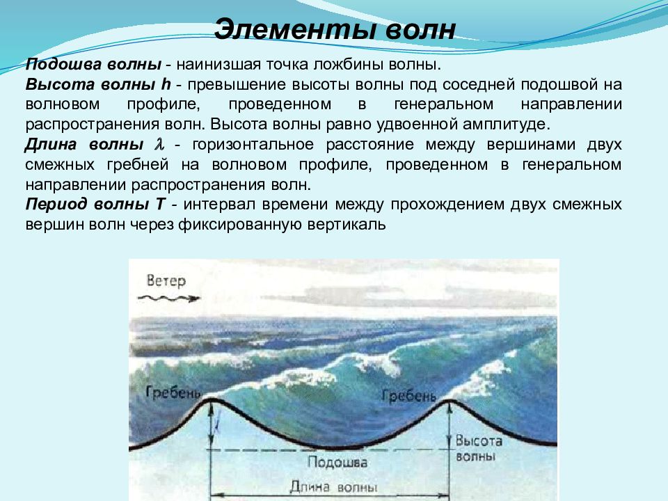 Подошва волны - наинизшая точка ложбины волны. Высота волны h - превышение высоты волны под соседней подошвой на волновом профиле, проведенном в генеральном направлении распространения волн. Высота волны равно удвоенной амплитуде. Длина волны - горизонтальное расстояние между вершинами двух смежных гребней на волновом профиле, проведенном в генеральном направлении распространения волн. Период волны T - интервал времени между прохождением двух смежных вершин волн через фиксированную вертикаль