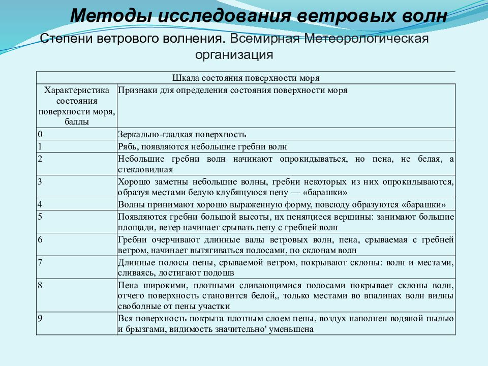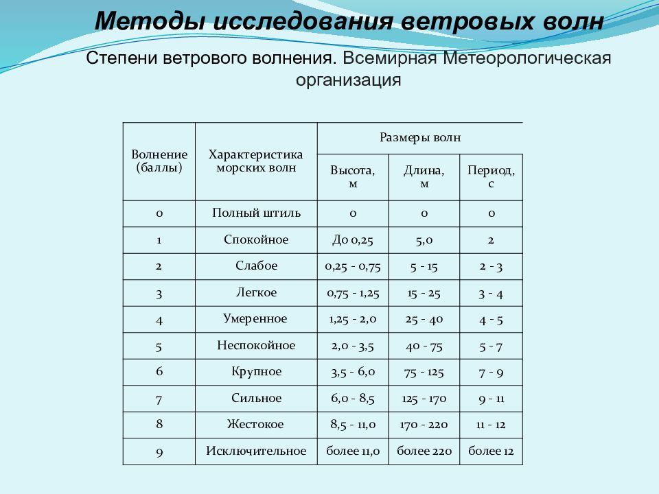 Волнение (баллы) Характеристика морских волн Размеры волн Высота, м Длина, м Период, с 0 Полный штиль 0 0 0 1 Спокойное До 0,25 5,0 2 2 Слабое 0,25 - 0,75 5 - 15 2 - 3 3 Легкое 0,75 - 1,25 15 - 25 3 - 4 4 Умеренное 1,25 - 2,0 25 - 40 4 - 5 5 Неспокойное 2,0 - 3,5 40 - 75 5 - 7 6 Крупное 3,5 - 6,0 75 - 125 7 - 9 7 Сильное 6,0 - 8,5 125 - 170 9 - 11 8 Жестокое 8,5 - 11,0 170 - 220 11 - 12 9 Исключительное более 11,0 более 220 более 12 Степени ветрового волнения. Всемирная Метеорологическая организация Методы исследования ветровых волн