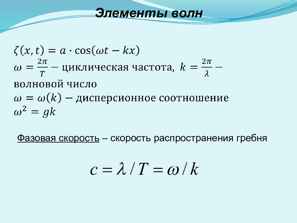 Фазовая скорость – скорость распространения гребня Элементы волн