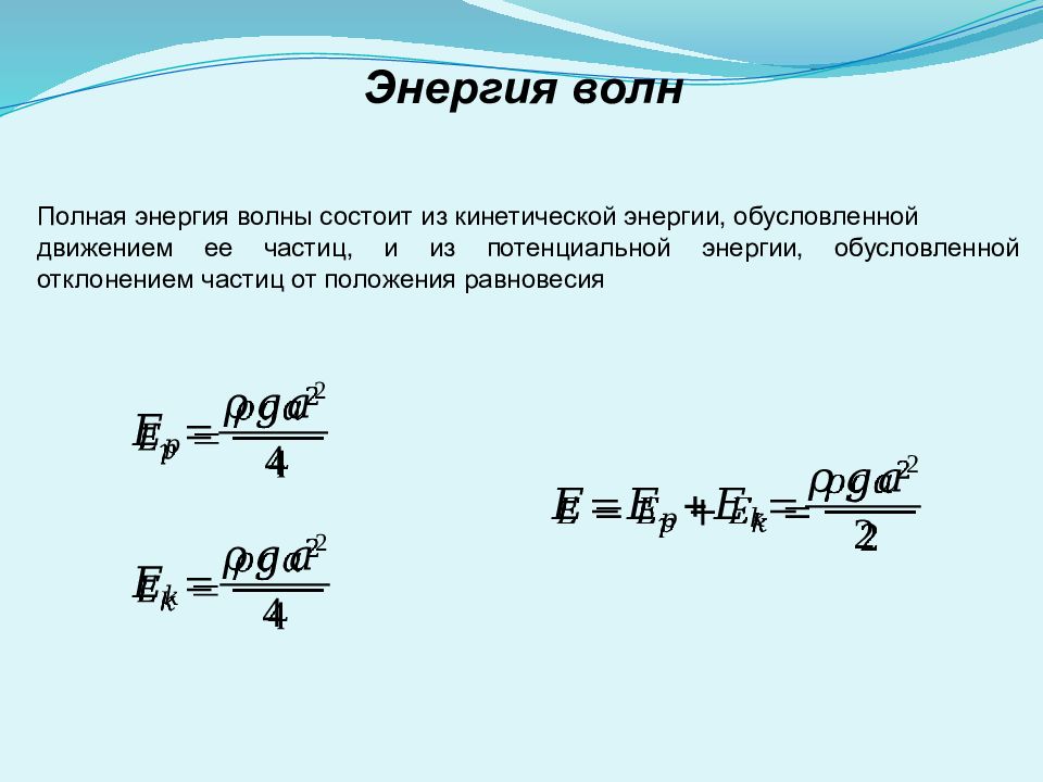 Полная энергия волны состоит из кинетической энергии, обусловленной движением ее частиц, и из потенциальной энергии, обусловленной отклонением частиц от положения равновесия