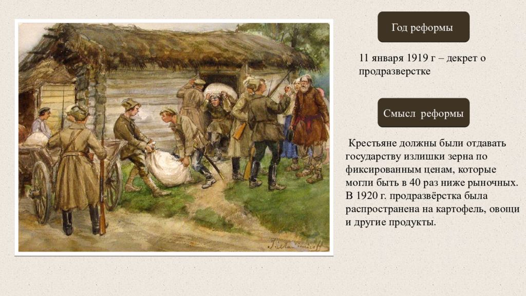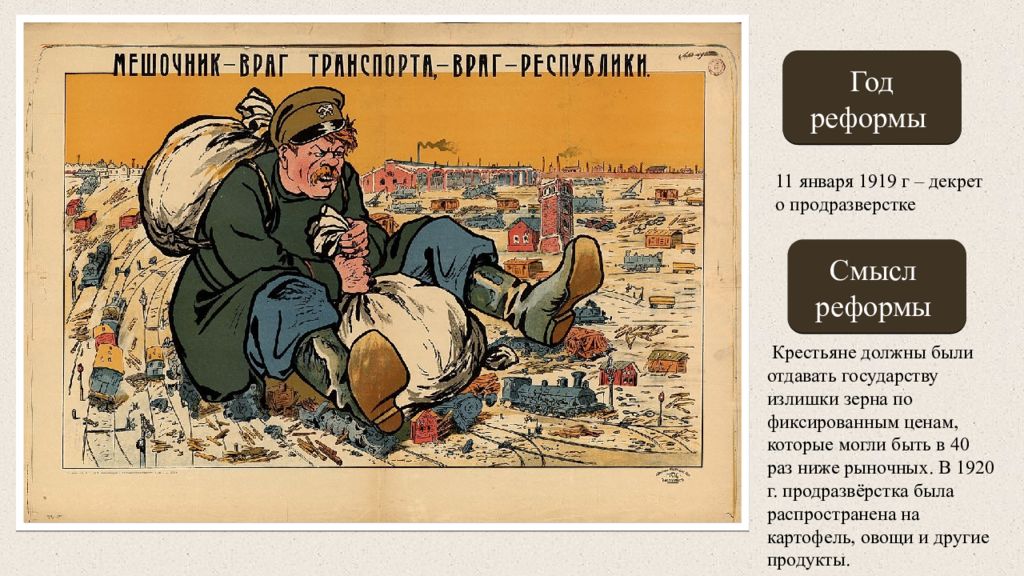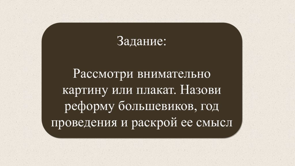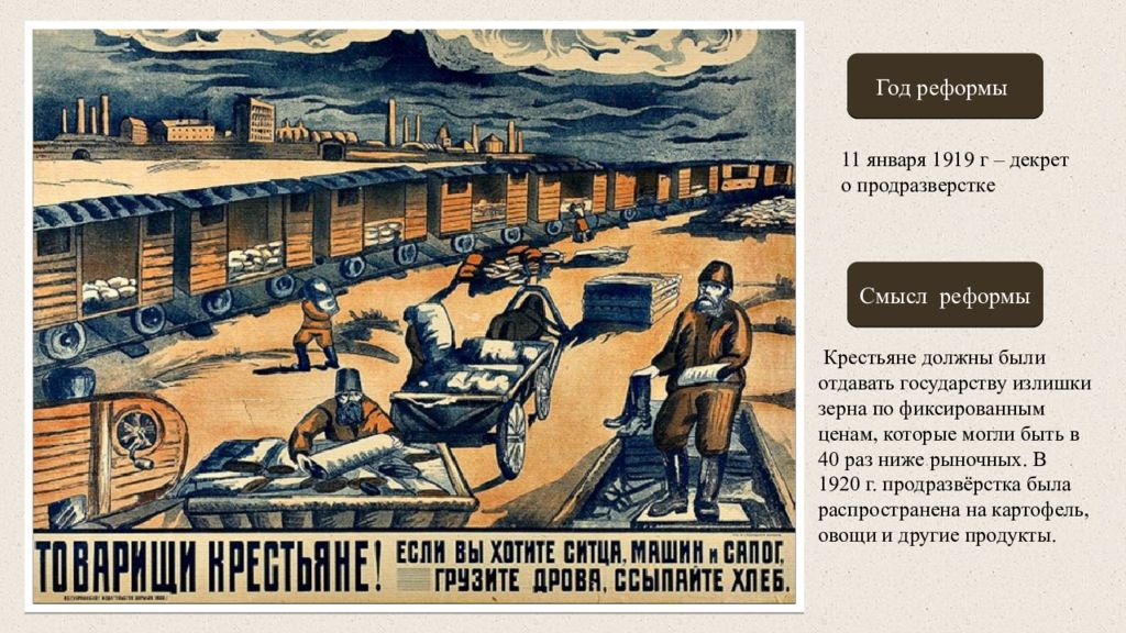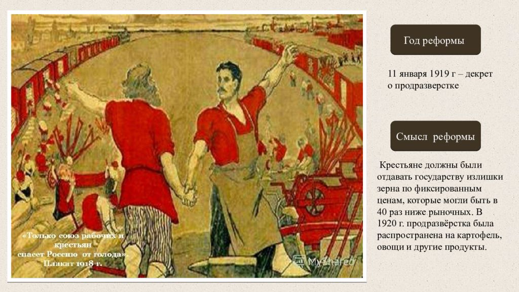 Задание: Рассмотри внимательно картину или плакат. Назови реформу большевиков, год проведения и раскрой ее смысл