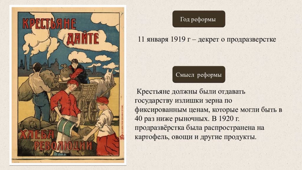Год реформы Смысл реформы 11 января 1919 г – декрет о продразверстке Крестьяне должны были отдавать государству излишки зерна по фиксированным ценам, которые могли быть в 40 раз ниже рыночных. В 1920 г. продразвёрстка была распространена на картофель, овощи и другие продукты.