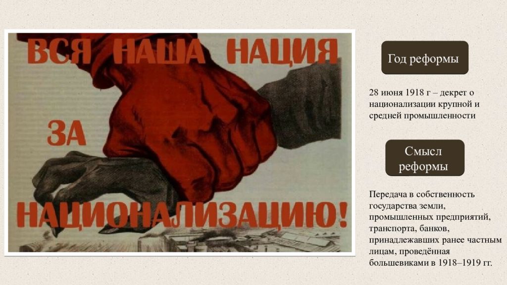Год реформы Смысл реформы 28 июня 1918 г – декрет о национализации крупной и средней промышленности П ередача в собственность государства земли, промышленных предприятий, транспорта, банков, принадлежавших ранее частным лицам, проведённая большевиками в 1918–1919 гг.