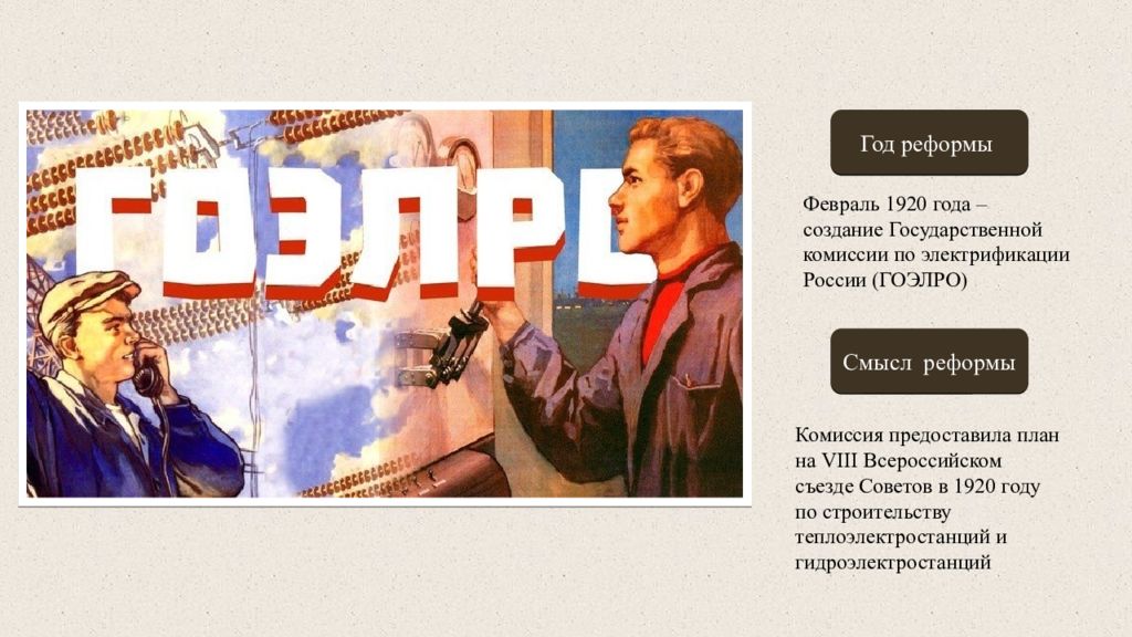 Год реформы Смысл реформы Февраль 1920 года – создание Государственной комиссии по электрификации России (ГОЭЛРО) Комиссия предоставила план на VIII Всероссийском съезде Советов в 1920 году по строительству теплоэлектростанций и гидроэлектростанций