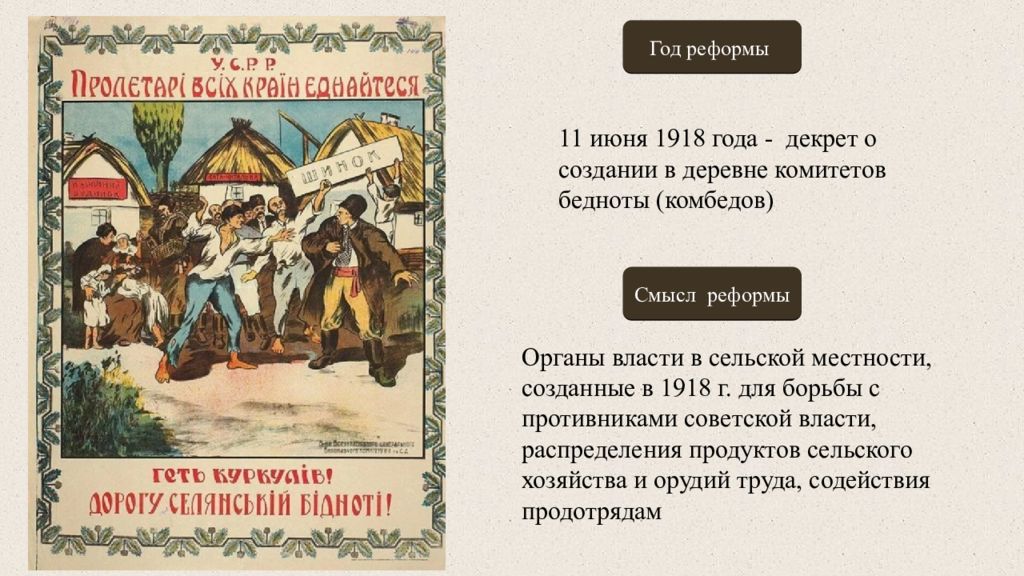 Год реформы Смысл реформы 11 июня 1918 года - декрет о создании в деревне комитетов бедноты (комбедов) О рганы власти в сельской местности, созданные в 1918 г. для борьбы с противниками советской власти, распределения продуктов сельского хозяйства и орудий труда, содействия продотрядам