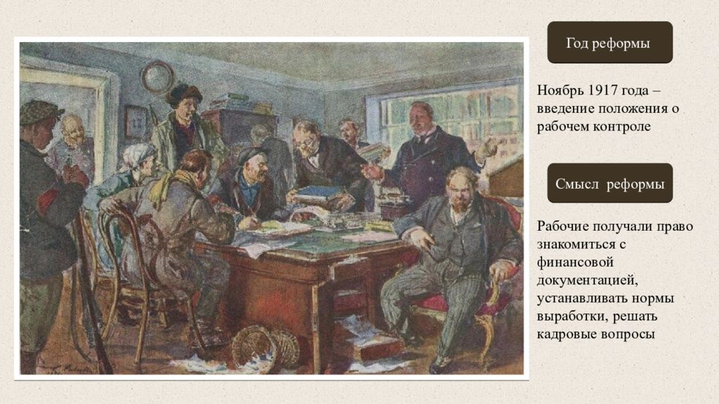 Год реформы Смысл реформы Ноябрь 1917 года – введение положения о рабочем контроле Рабочие получали право знакомиться с финансовой документацией, устанавливать нормы выработки, решать кадровые вопросы
