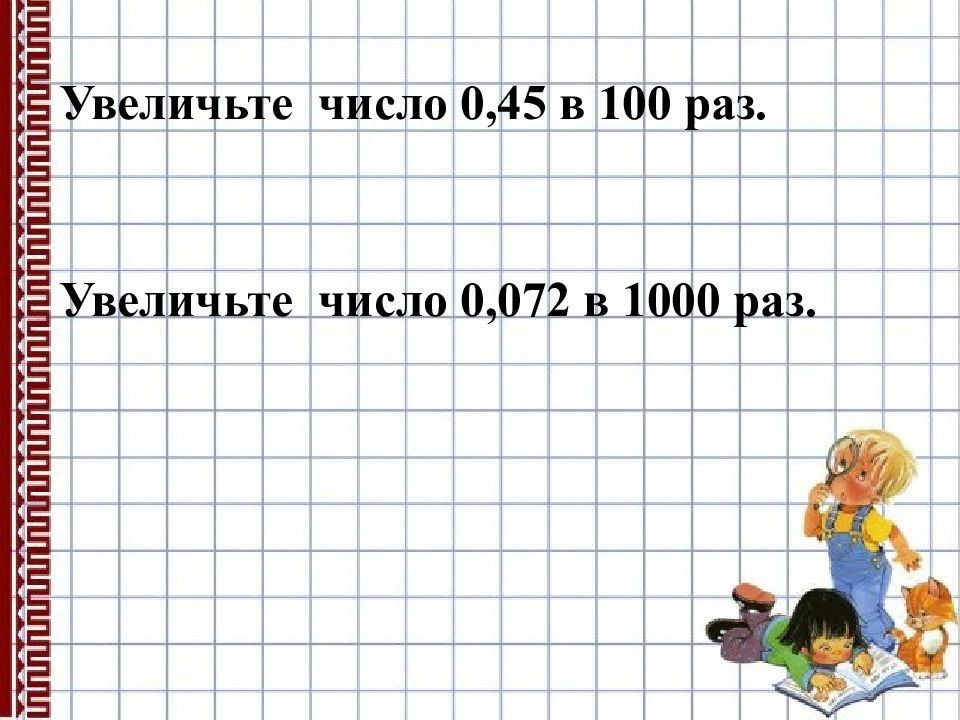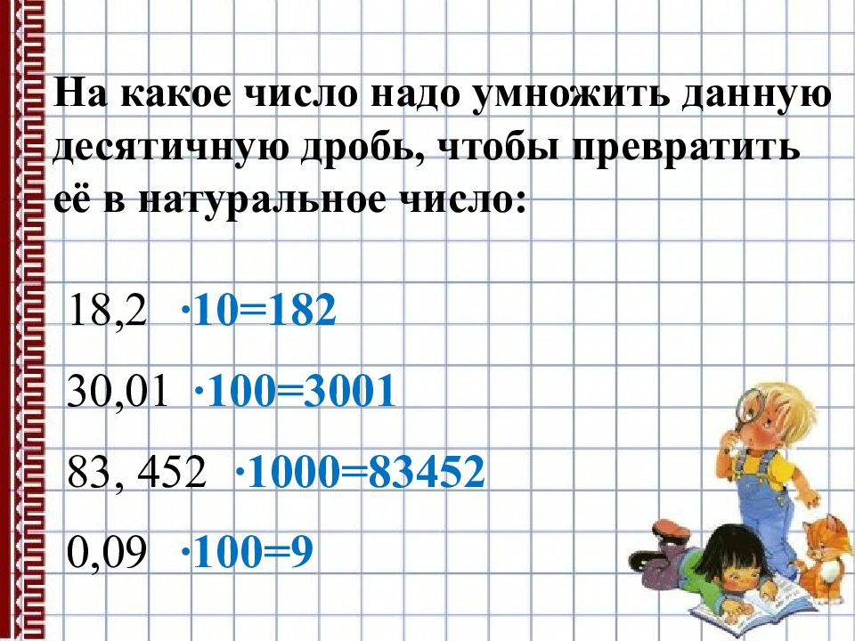 На какое число надо умножить данную десятичную дробь, чтобы превратить её в натуральное число: 18,2 30,01 83, 452 0,09 ∙10=182 ∙100=3001 ∙1000=83452 ∙100=9