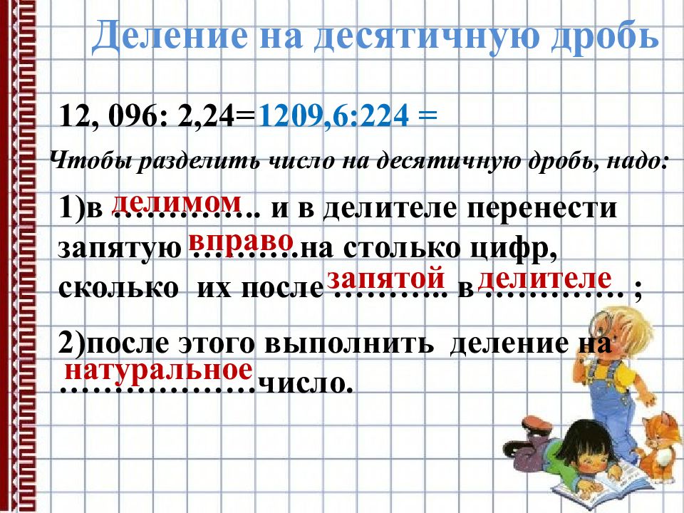 12, 096: 2, 24= 1209,6:224 = Чтобы разделить число на десятичную дробь, надо: 1)в ………….. и в делителе перенести запятую ……….на столько цифр, сколько их после ……….. в …………. ; 2)после этого выполнить деление на ………………число. делимом вправо запятой делителе натуральное