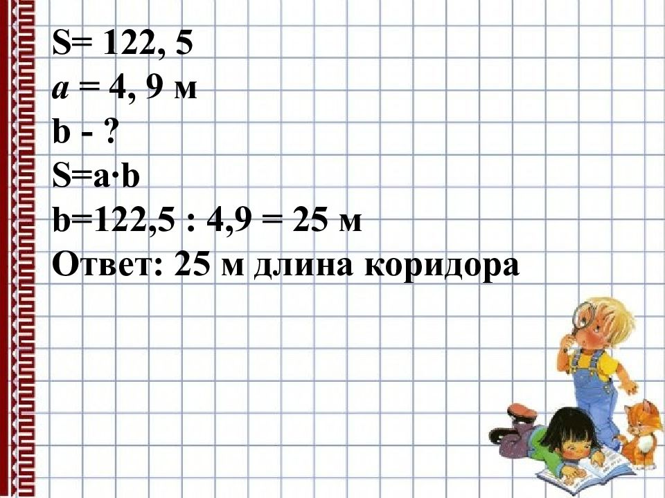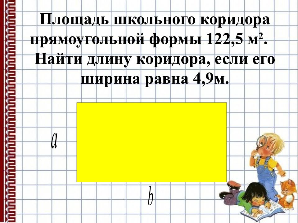 Площадь школьного коридора прямоугольной формы 122,5 м 2. Найти длину коридора, если его ширина равна 4,9м.