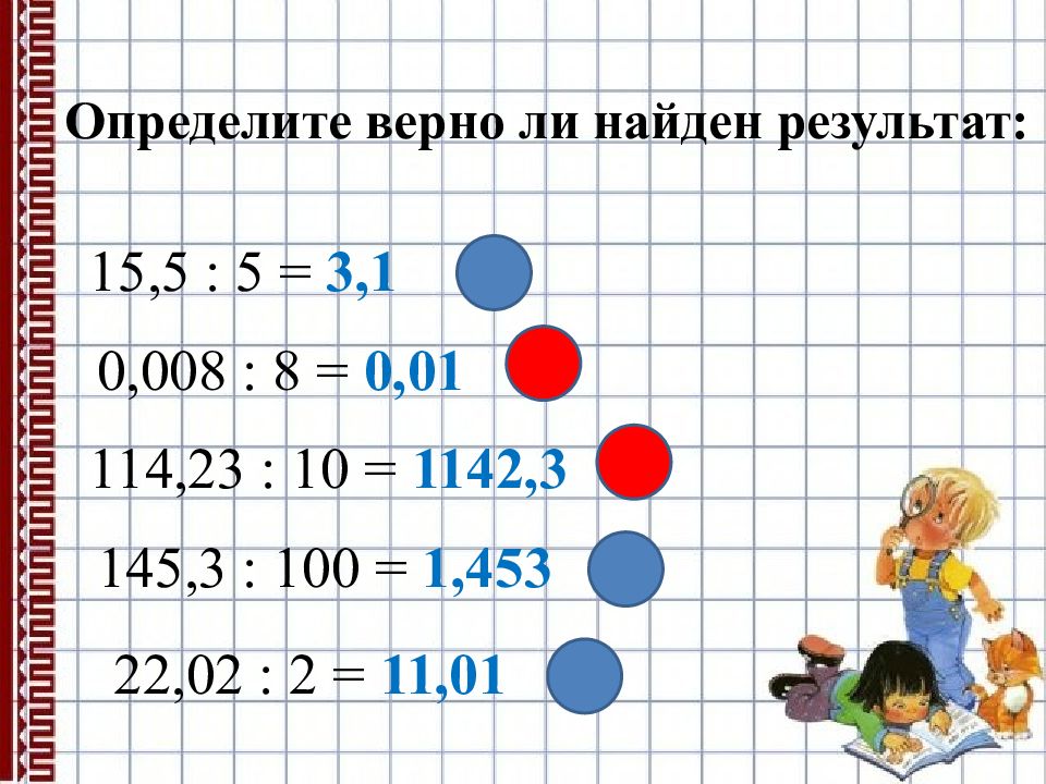 Определите верно ли найден результат: 15,5 : 5 = 3,1 0,008 : 8 = 0,01 114,23 : 10 = 1142,3 145,3 : 100 = 1,453 22,02 : 2 = 11,01