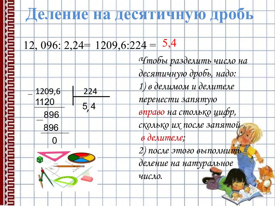 12, 096: 2,24= 1209,6:224 = 1209,6 224 5 1120 89 , 6 4 896 0 Чтобы разделить число на десятичную дробь, надо: 1) в делимом и делителе перенести запятую вправо на столько цифр, сколько их после запятой в делителе ; 2) после этого выполнить деление на натуральное число. 5,4