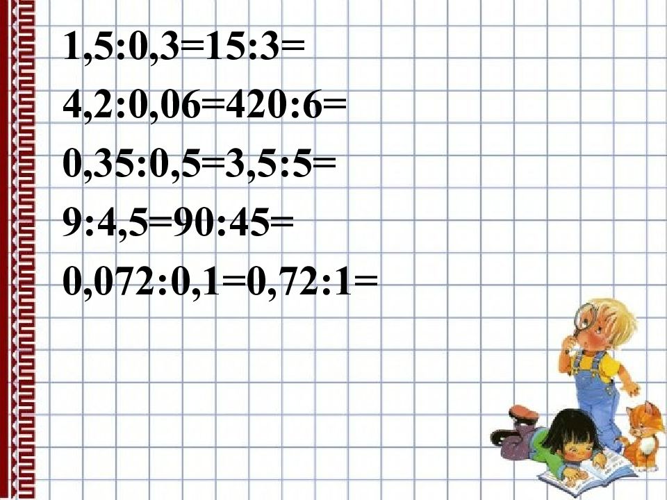 1,5:0,3=15:3= 4,2:0,06=420:6= 0,35:0,5=3,5:5= 9:4,5=90:45= 0,072:0,1=0,72:1=