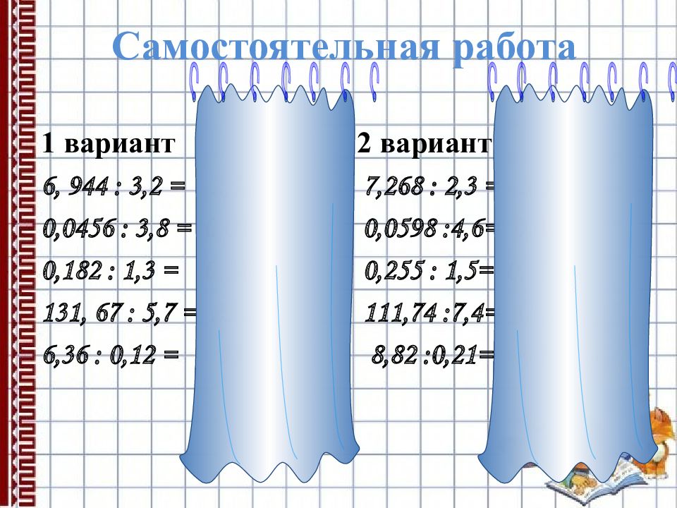 1 вариант 2 вариант 6, 944 : 3,2 = 2,17 7,268 : 2,3 = 3,16 0,0456 : 3,8 = 0,012 0,0598 :4,6= 0,013 0,182 : 1,3 = 0,14 0,255 : 1,5= 0, 17 131, 67 : 5,7 = 23,1 111,74 :7,4= 15,1 6,36 : 0,12 = 53 8,82 :0,21= 42 Самостоятельная работа