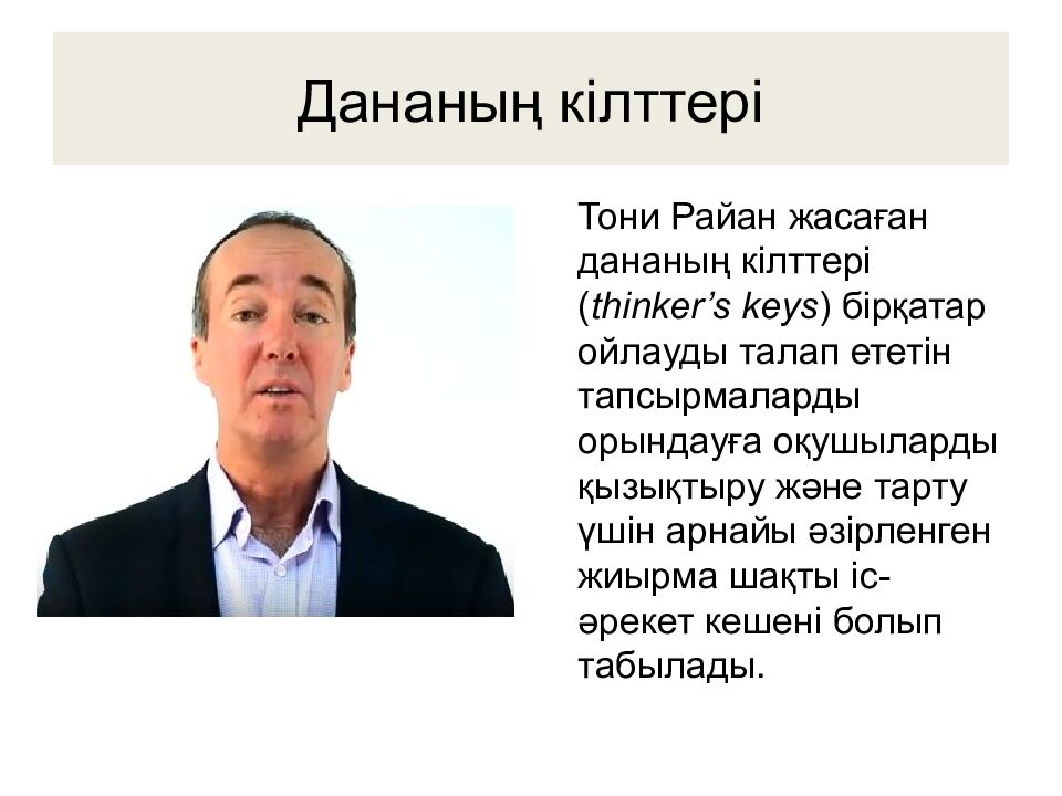 Тони Райан жасаған дананың кілттері ( thinker’s keys ) бірқатар ойлауды талап ететін тапсырмаларды орындауға оқушыларды қызықтыру және тарту үшін арнайы әзірленген жиырма шақты іс-әрекет кешені болып табылады.
