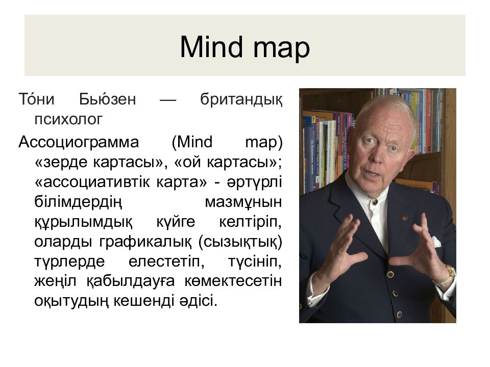 То́ни Бью́зен — британ ды қ психолог Ассоциограмма ( Mind map ) « зерде картасы», « ой картасы»; «ассоциативтік карта» - әр түрлі білімдердің мазмұнын құрылымдық күйге келтіріп, оларды графикалық ( сызықтық ) түрлерде елестетіп, түсініп, жеңіл қабылдауға көмектесетін оқытудың кешенді әдісі.