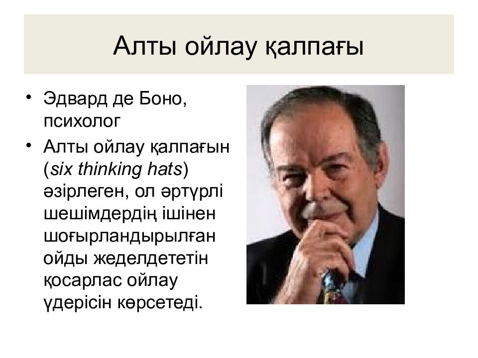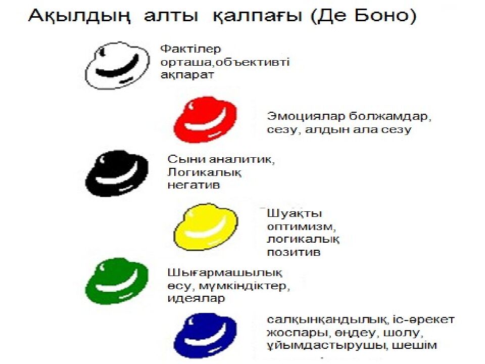 Эдвард де Боно, психолог Алты ойлау қалпағын ( six thinking hats ) әзірлеген, ол әртүрлі шешімдердің ішінен шоғырландырылған ойды жеделдететін қосарлас ойлау үдерісін көрсетеді.