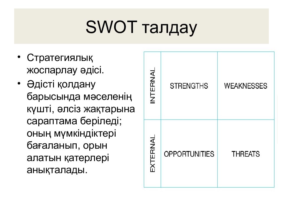 Стратегиялық жоспарлау әдісі. Әдісті қолдану барысында мәселенің күшті, әлсіз жақтарына сараптама беріледі; оның мүмкіндіктері бағаланып, орын алатын қатерлері анықталады.