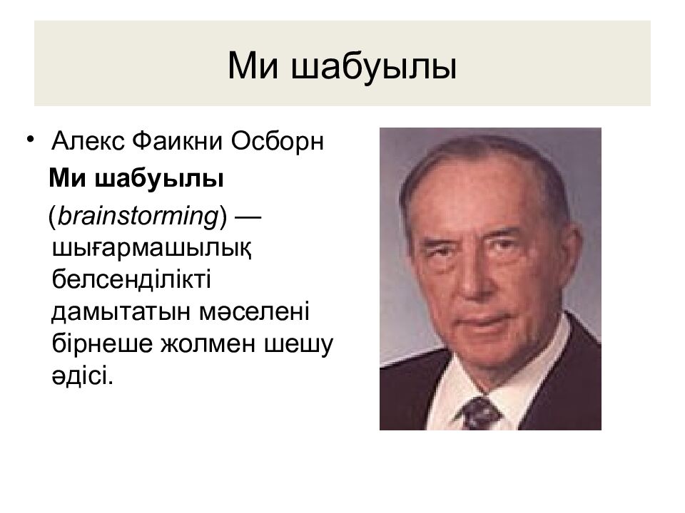 Алекс Фаикни Осборн Ми шабуылы ( brainstorming ) —шығармашылық белсенділікті дамытатын мәселені бірнеше жолмен шешу әдісі.