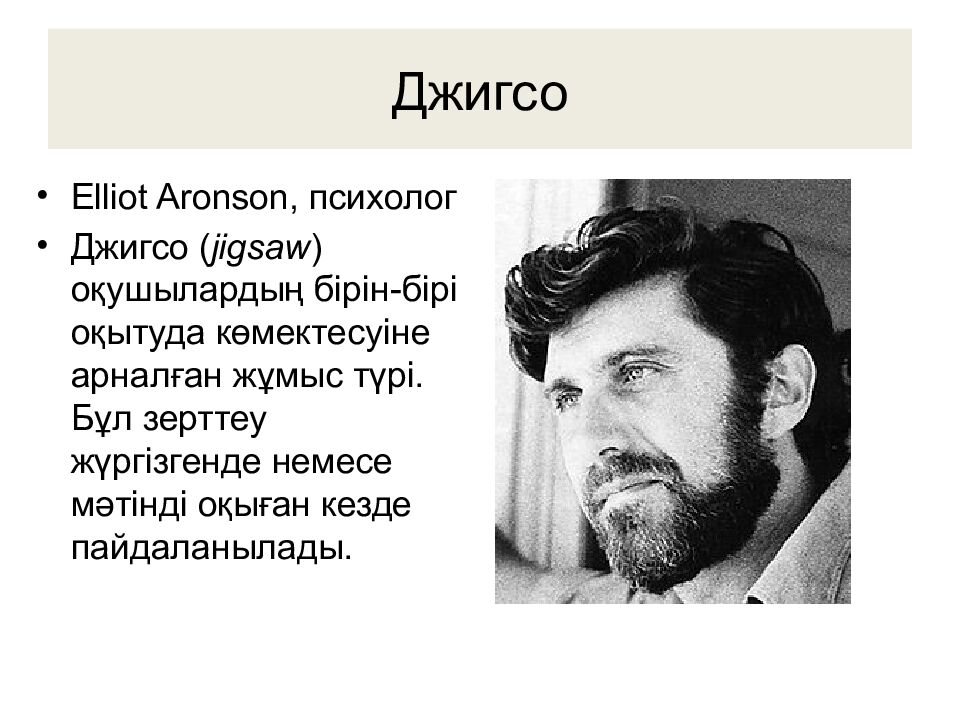 Elliot Aronson, психолог Джигсо ( jigsaw ) оқушылардың бірін-бірі оқытуда көмектесуіне арналған жұмыс түрі. Бұл зерттеу жүргізгенде немесе мәтінді оқыған кезде пайдаланылады.