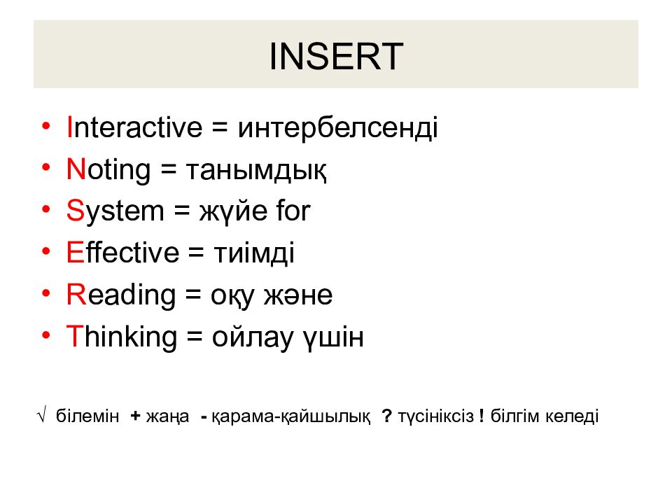 I nteractive = интербелсенді N oting = танымдық S ystem = жүйе for E ffective = тиімді R eading = оқу және T hinking = ойлау үшін √ білемін + жаңа - қарама-қайшылық ? түсініксіз ! білгім келеді
