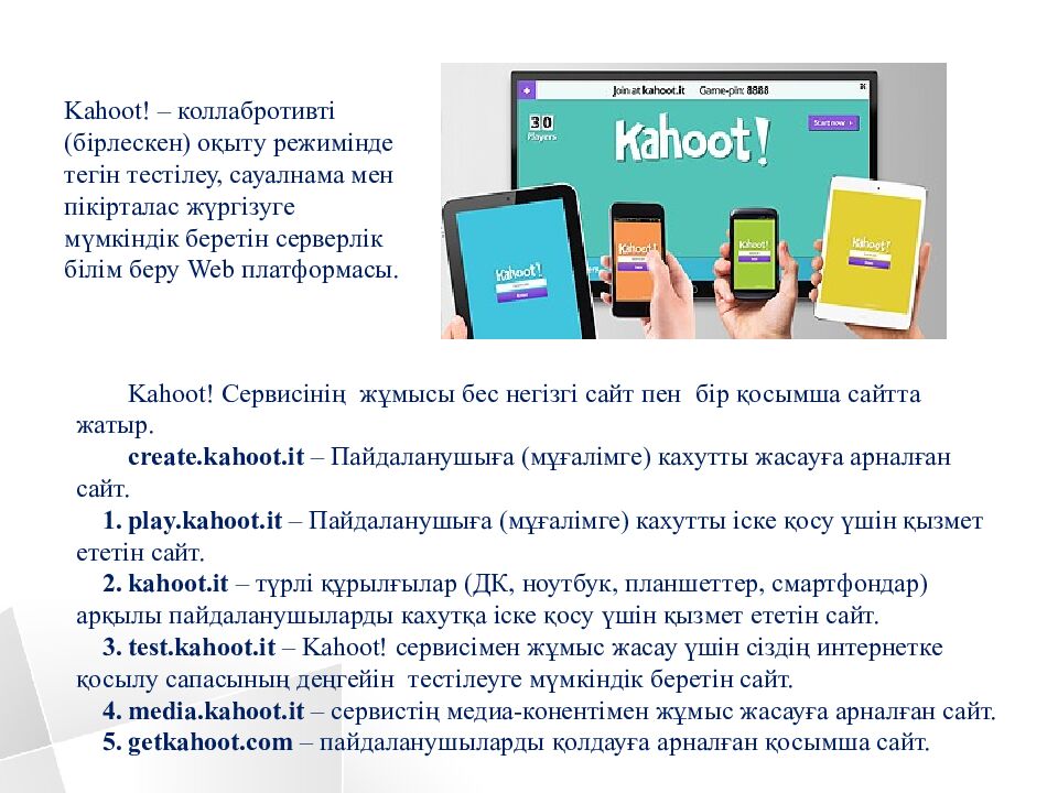 Kahoot! – коллабротивті ( бірлескен ) оқыту режимінде тегін тестілеу, сауалнама мен пікірталас жүргізуге мүмкіндік беретін серверлік білім беру Web платформасы. Kahoot! Сервисінің жұмысы бес негізгі сайт пен бір қосымша сайтта жатыр. create.kahoot.it – Пайдаланушыға (мұғалімге) кахутты жасауға арналған сайт. play.kahoot.it – Пайдаланушыға (мұғалімге) кахутты іске қосу үшін қызмет ететін сайт. kahoot.it – түрлі құрылғылар (ДК, ноутбук, планшеттер, смартфондар) арқылы пайдаланушыларды кахутқа іске қосу үшін қызмет ететін сайт. test.kahoot.it – Kahoot! сервисімен жұмыс жасау үшін сіздің интернетке қосылу сапасының деңгейін тестілеуге мүмкіндік беретін сайт. media.kahoot.it – сервистің медиа-конентімен жұмыс жасауға арналған сайт. getkahoot.com – пайдаланушыларды қолдауға арналған қосымша сайт.