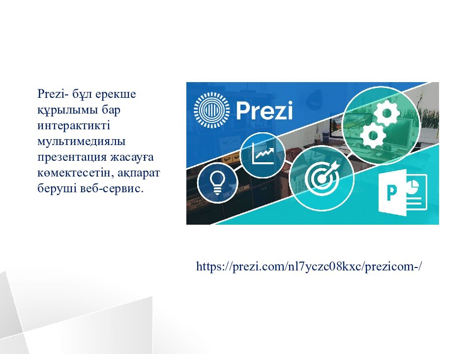Prezi- бұл ерекше құрылымы бар интерактикті мультимедиялы презентация жасауға көмектесетін, ақпарат беруші веб-сервис. https://prezi.com/nl7yczc08kxc/prezicom-/