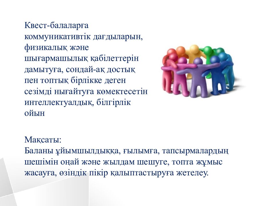 Квест-балаларға коммуникативтік дағдыларын, физикалық және шығармашылық қабілеттерін дамытуға, сондай-ақ достық пен топтық бірлікке деген сезімді нығайтуға көмектесетін интеллектуалдық, білгірлік ойын Мақсаты : Баланы ұйымшылдыққа, ғылымға, тапсырмалардың шешімін оңай және жылдам шешуге, топта жұмыс жасауға, өзіндік пікір қалыптастыруға жетелеу.