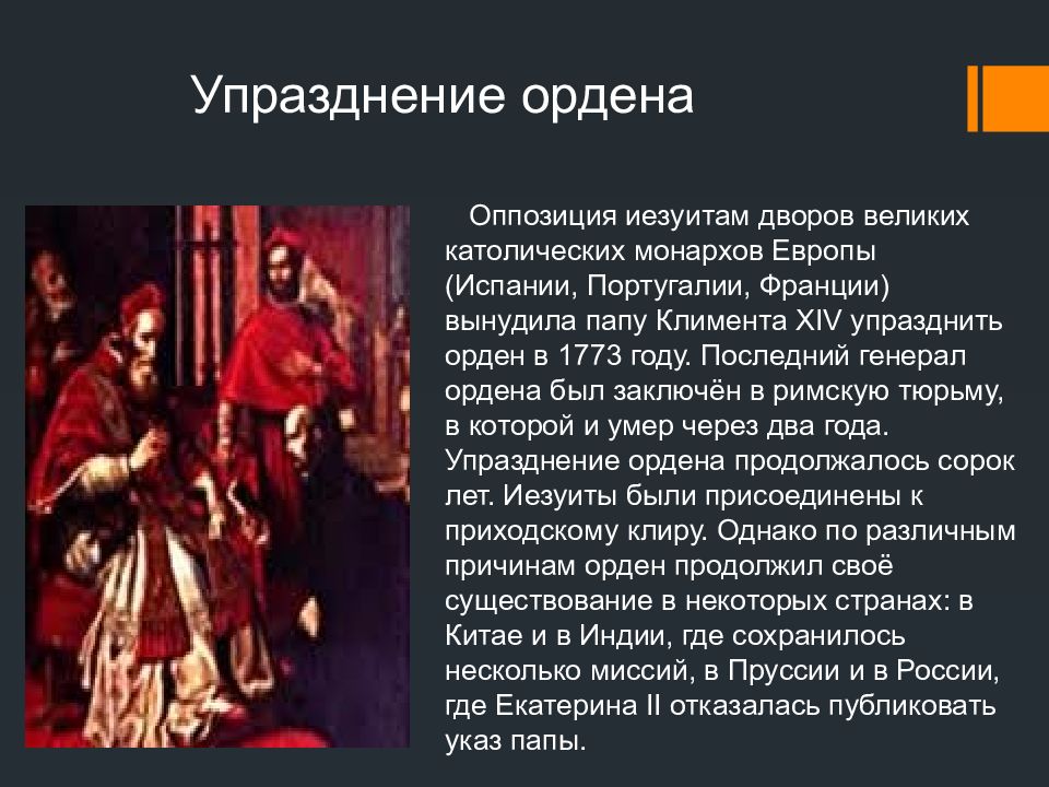 Оппозиция иезуитам дворов великих католических монархов Европы (Испании, Португалии, Франции) вынудила папу Климента XIV упразднить орден в 1773 году. Последний генерал ордена был заключён в римскую тюрьму, в которой и умер через два года. Упразднение ордена продолжалось сорок лет. Иезуиты были присоединены к приходскому клиру. Однако по различным причинам орден продолжил своё существование в некоторых странах: в Китае и в Индии, где сохранилось несколько миссий, в Пруссии и в России, где Екатерина II отказалась публиковать указ папы. Упразднение ордена