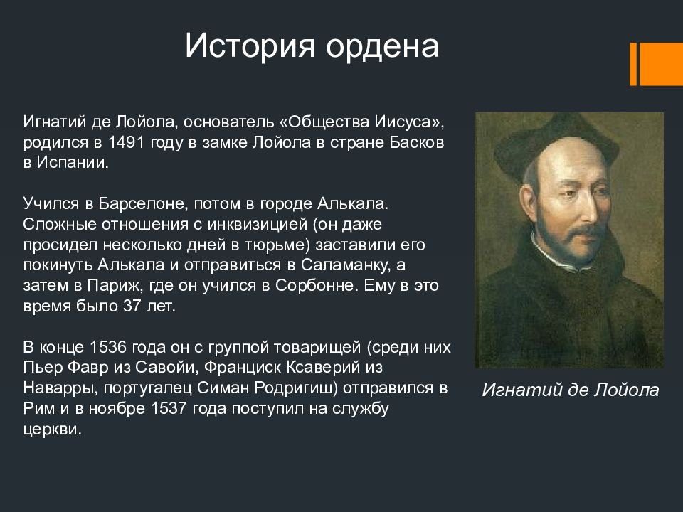 История ордена Игнатий де Лойола, основатель «Общества Иисуса», родился в 1491 году в замке Лойола в стране Басков в Испании. У чился в Барселоне, потом в городе Алькала. Сложные отношения с инквизицией (он даже просидел несколько дней в тюрьме) заставили его покинуть Алькала и отправиться в Саламанку, а затем в Париж, где он учился в Сорбонне. Ему в это время было 37 лет. В конце 1536 года он с группой товарищей (среди них Пьер Фавр из Савойи, Франциск Ксаверий из Наварры, португалец Симан Родригиш ) отправился в Рим и в ноябре 1537 года поступил на службу церкви. Игнатий де Лойола