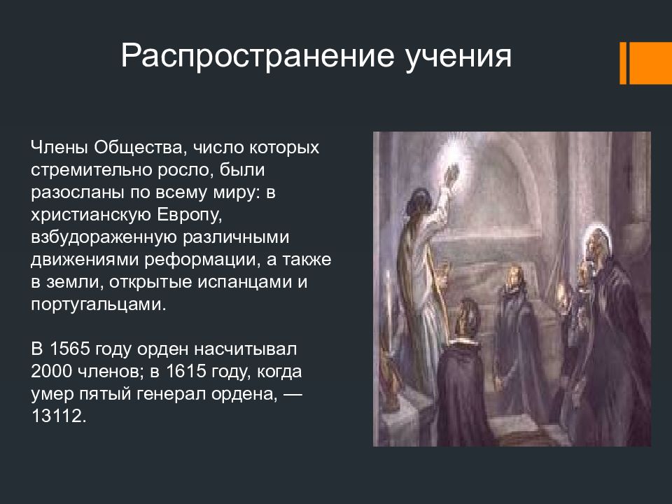 Члены Общества, число которых стремительно росло, были разосланы по всему миру: в христианскую Европу, взбудораженную различными движениями реформации, а также в земли, открытые испанцами и португальцами. В 1565 году орден насчитывал 2000 членов; в 1615 году, когда умер пятый генерал ордена, — 13112. Распространение учения
