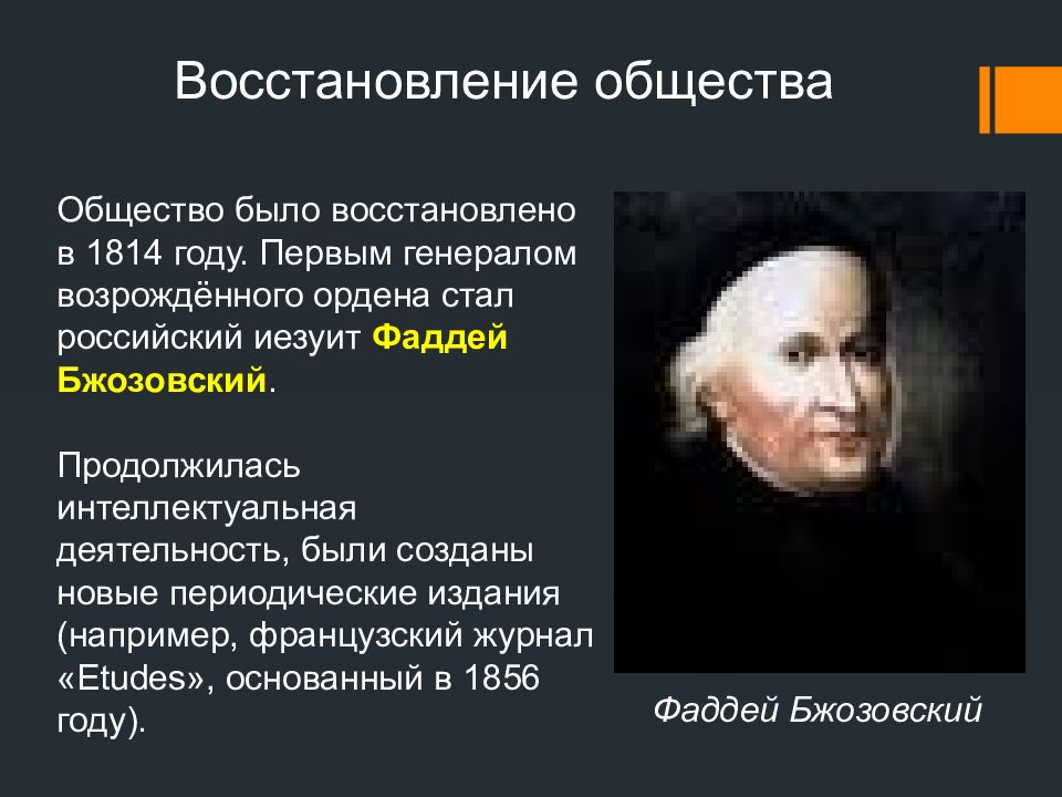 Общество было восстановлено в 1814 году. Первым генералом возрождённого ордена стал российский иезуит Фаддей Бжозовский. Продолжилась интеллектуальная деятельность, были созданы новые периодические издания (например, французский журнал « Etudes », основанный в 1856 году). Восстановление общества Фаддей Бжозовский