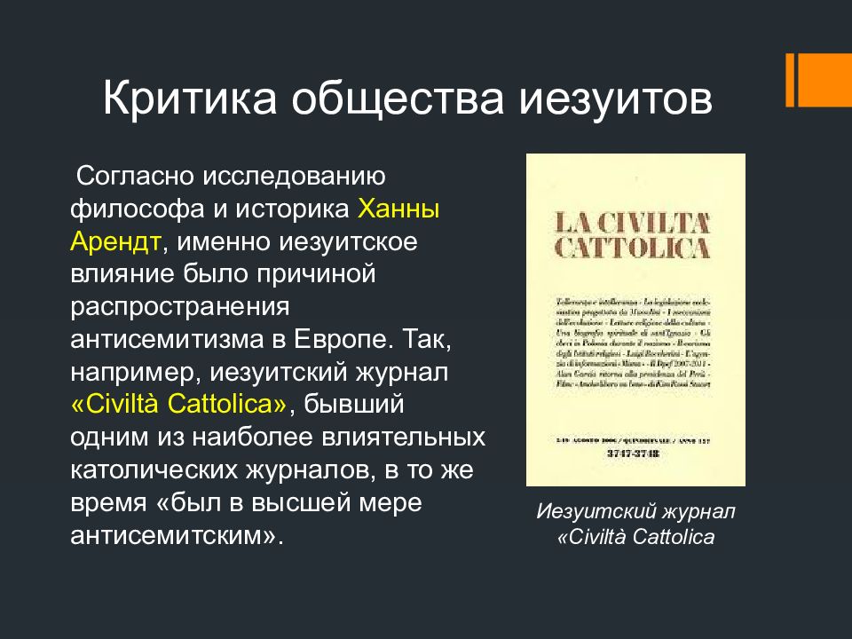 Согласно исследованию философа и историка Ханны Арендт, именно иезуитское влияние было причиной распространения антисемитизма в Европе. Так, например, иезуитский журнал « Civiltà Cattolica », бывший одним из наиболее влиятельных католических журналов, в то же время «был в высшей мере антисемитским». И езуитский журнал « Civiltà Cattolica