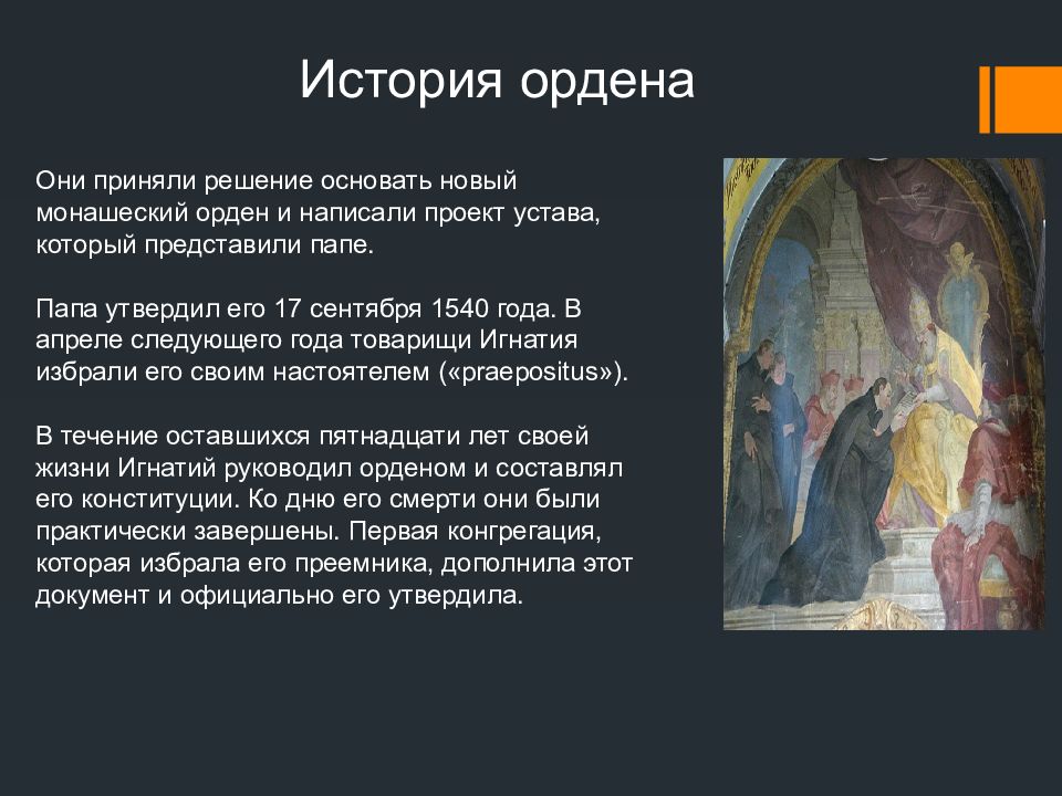 История ордена О ни приняли решение основать новый монашеский орден и написали проект устава, который представили папе. Папа утвердил его 17 сентября 1540 года. В апреле следующего года товарищи Игнатия избрали его своим настоятелем (« praepositus »). В течение оставшихся пятнадцати лет своей жизни Игнатий руководил орденом и составлял его конституции. Ко дню его смерти они были практически завершены. Первая конгрегация, которая избрала его преемника, дополнила этот документ и официально его утвердила.