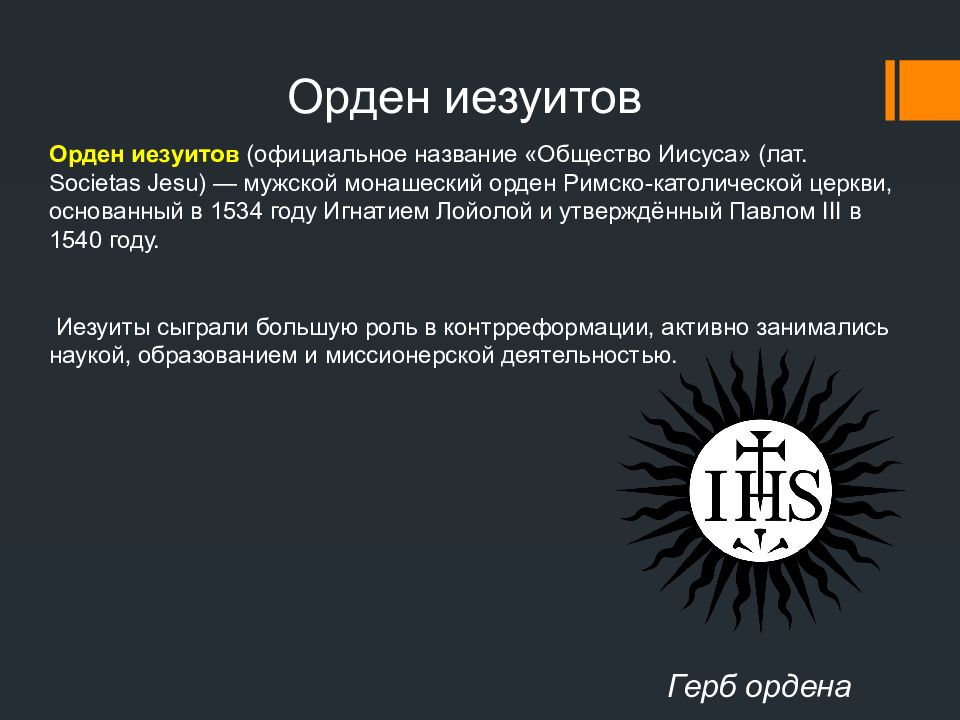 Орден иезуитов (официальное название «Общество Иисуса» (лат. Societas Jesu ) — мужской монашеский орден Римско-католической церкви, основанный в 1534 году Игнатием Лойолой и утверждённый Павлом III в 1540 году. Иезуиты сыграли большую роль в контрреформации, активно занимались наукой, образованием и миссионерской деятельностью. Орден иезуитов Герб ордена