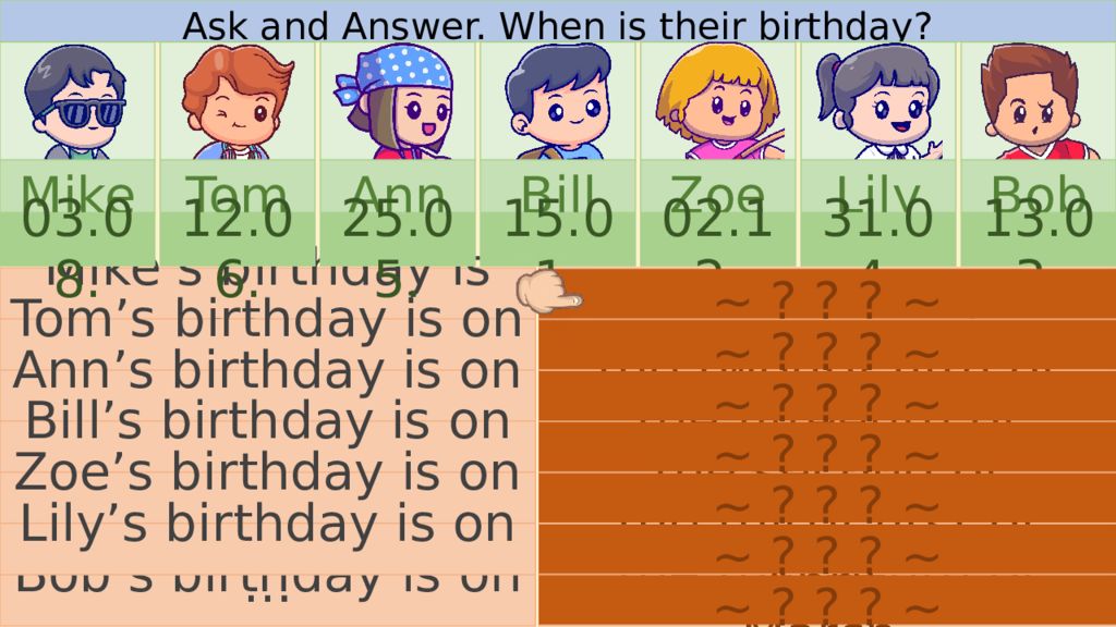 Ask and Answer. When is their birthday? Mike’s birthday is on … the third of August. Tom’s birthday is on … the twelfth of June. Ann’s birthday is on … the twenty-fifth of May. Bill’s birthday is on … the fifteenth of January. Zoe’s birthday is on … the second of December. Bob’s birthday is on … the thirteenth of March. Lily’s birthday is on … the thirty-first of April. Mike Tom Ann Bill Zoe Lily Bob 03.08. 12.06. 25.05. 15.01. 02.12. 31.04. 13.03. ~ ? ? ? ~ ~ ? ? ? ~ ~ ? ? ? ~ ~ ? ? ? ~ ~ ? ? ? ~ ~ ? ? ? ~ ~ ? ? ? ~
