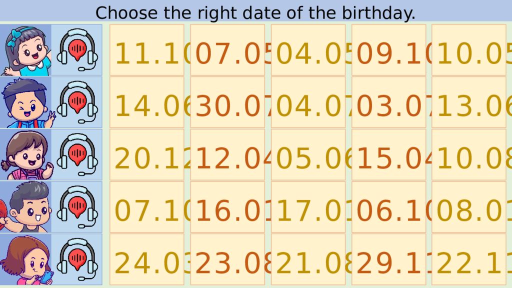 Choose the right date of the birthday. 11.10. 07.05. 04.05. 09.10. 14.06 30.07. 04.07. 03.07. 20.12. 12.04. 05.06. 15.04. 07.10. 16.01. 17.01. 06.10. 24.03. 23.08. 21.08. 29.11. 10.05. 13.06. 10.08 08.01. 22.11.