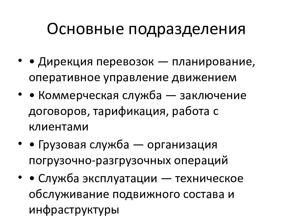 • Дирекция перевозок — планирование, оперативное управление движением • Коммерческая служба — заключение договоров, тарификация, работа с клиентами • Грузовая служба — организация погрузочно-разгрузочных операций • Служба эксплуатации — техническое обслуживание подвижного состава и инфраструктуры • Отделы маркетинга и логистики — анализ рынка, внедрение новых услуг
