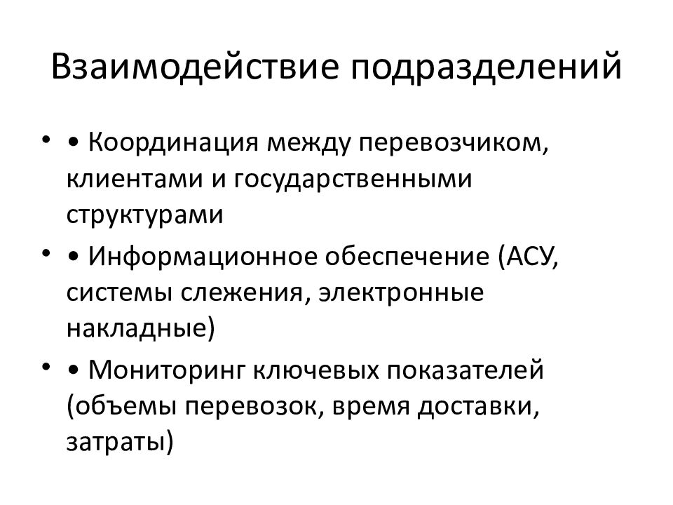 • Координация между перевозчиком, клиентами и государственными структурами • Информационное обеспечение (АСУ, системы слежения, электронные накладные) • Мониторинг ключевых показателей (объемы перевозок, время доставки, затраты)