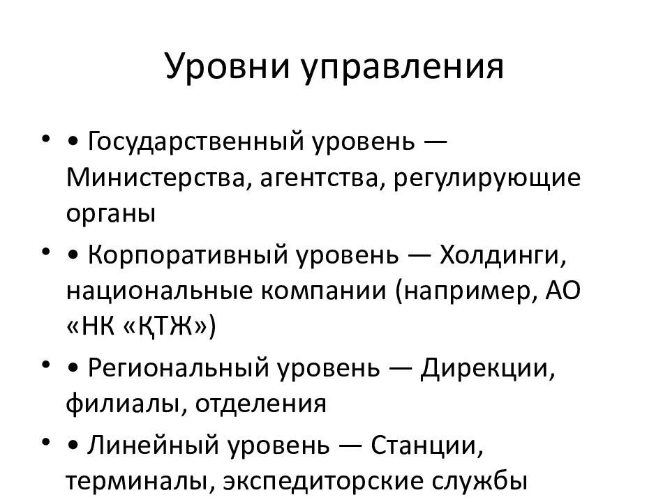• Государственный уровень — Министерства, агентства, регулирующие органы • Корпоративный уровень — Холдинги, национальные компании (например, АО «НК «ҚТЖ») • Региональный уровень — Дирекции, филиалы, отделения • Линейный уровень — Станции, терминалы, экспедиторские службы