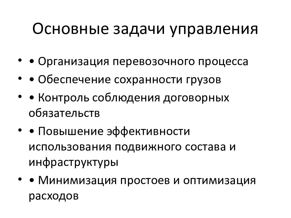 • Организация перевозочного процесса • Обеспечение сохранности грузов • Контроль соблюдения договорных обязательств • Повышение эффективности использования подвижного состава и инфраструктуры • Минимизация простоев и оптимизация расходов