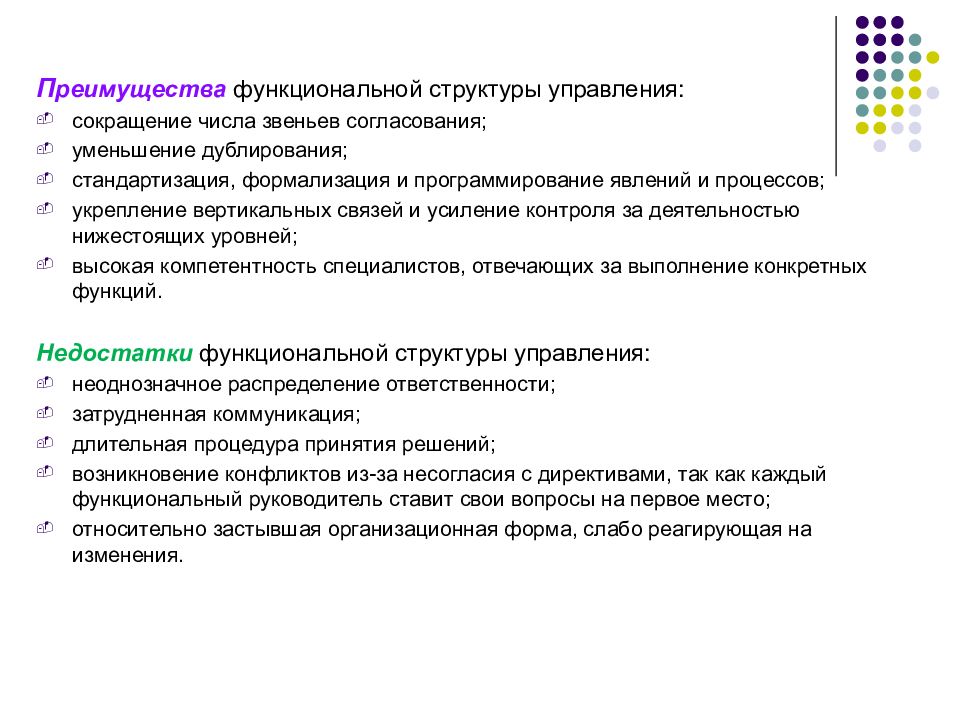 П реимущества функциональной структуры управления: сокращение числа звеньев согласования ; уменьшение дублирования; стандартизация, формализация и программирование явлений и процессов; укрепление вертикальных связей и усиление контроля за деятельностью нижестоящих уровней ; высокая компетентность специалистов, отвечающих за выполнение конкретных функций. Недостатки функциональной структуры управления: неоднозначное распределение ответственности; затрудненная коммуникация; длительная процедура принятия решений; возникновение конфликтов из-за несогласия с директивами, так как каждый функциональный руководитель ставит свои вопросы на первое место; относительно застывшая организационная форма, слабо реагирующая на изменения.