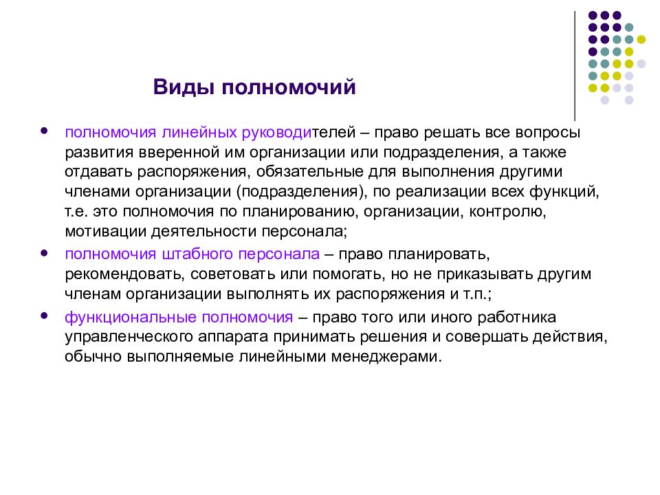 полномочия линейных руководи телей – право решать все вопросы развития вверенной им организации или подразделения, а также отдавать распоряжения, обязательные для выполнения другими членами организации (подразделения), по реализации всех функций, т.е. это полномочия по планированию, организации, контролю, мотивации деятельности персонала; полномочия штабного персонала – право планировать, рекомендовать, советовать или помогать, но не приказывать другим членам организации выполнять их распоряжения и т.п.; функциональные полномочия – право того или иного работника управленческого аппарата принимать решения и совершать действия, обычно выполняемые линейными менеджерами.