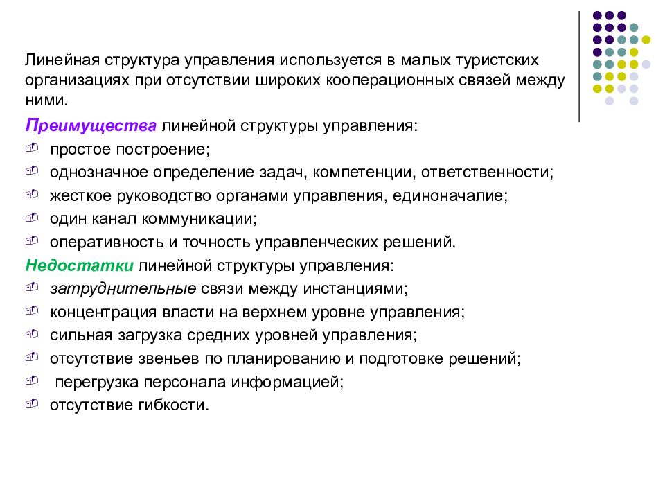 Линейная структура управления используется в малых туристских организациях при отсутствии широких кооперационных связей между ними. П реимущества линейной структуры управления: простое построение; однозначное определение задач, компетенции, ответственности; жесткое руководство органами управления, единоначалие; один канал коммуникации ; оперативность и точность управленческих решений. Недостатки линейной структуры управления: затруднительные связи между инстанциями; концентрация власти на верхнем уровне управления ; сильная загрузка средних уровней управления; отсутствие звеньев по планированию и подготовке решений ; перегрузка персонала информацией ; отсутствие гибкости.
