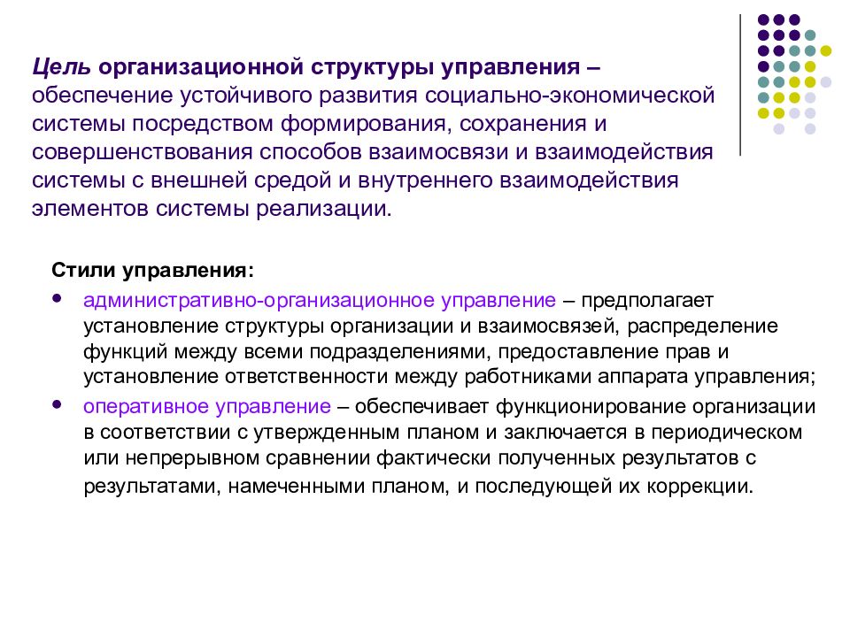 Слайд 3: Цель организационной структуры управления – обеспечение устойчивого развития социально-экономической системы посредством формирования, сохранения и совершенствования способов взаимосвязи и взаимодействия системы с внешней средой и внутреннего взаимодействия элементов системы реализации