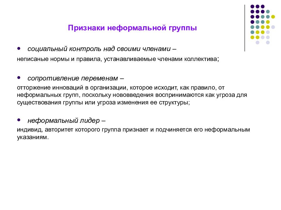 Признаки неформальной группы социальный контроль над своими членами – неписаные нормы и правила, устанавливаемые членами коллектива ; сопротивление переменам – отторжение инноваций в организации, которое исходит, как правило, от неформальных групп, поскольку нововведения воспринимаются как угроза для существования группы или угроза изменения ее структуры ; неформальный лидер – индивид, авторитет которого группа признает и подчиняется его неформальным указаниям.